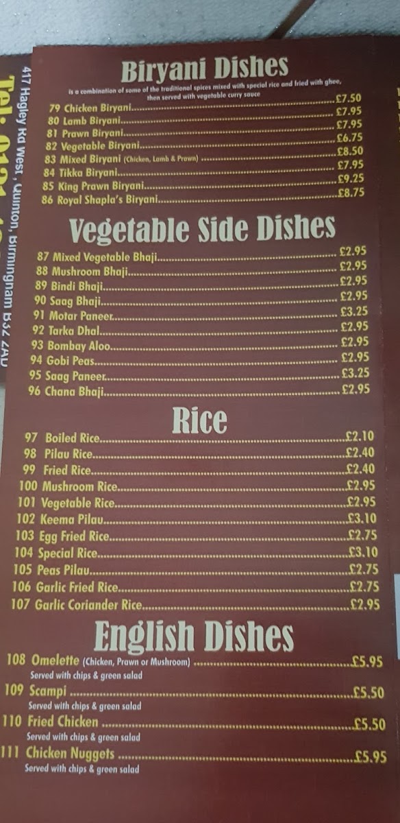 Welcome to Royal Shapla Quinton, a culinary gem nestled in Quinton, Birmingham. This restaurant brilliantly marries tradition with flavor, offering a diverse menu that reflects the rich heritage of South Asian cuisine. Whether you're in the mood for spicy curries, flavorful biryanis, or tantalizing starters, each dish is crafted with precision and attention to authenticity.